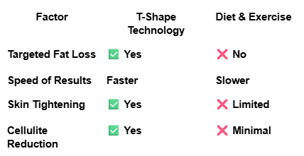 👉 Unlike traditional weight loss, which shrinks fat cells slowly, T-Shape accelerates this process in targeted areas.
